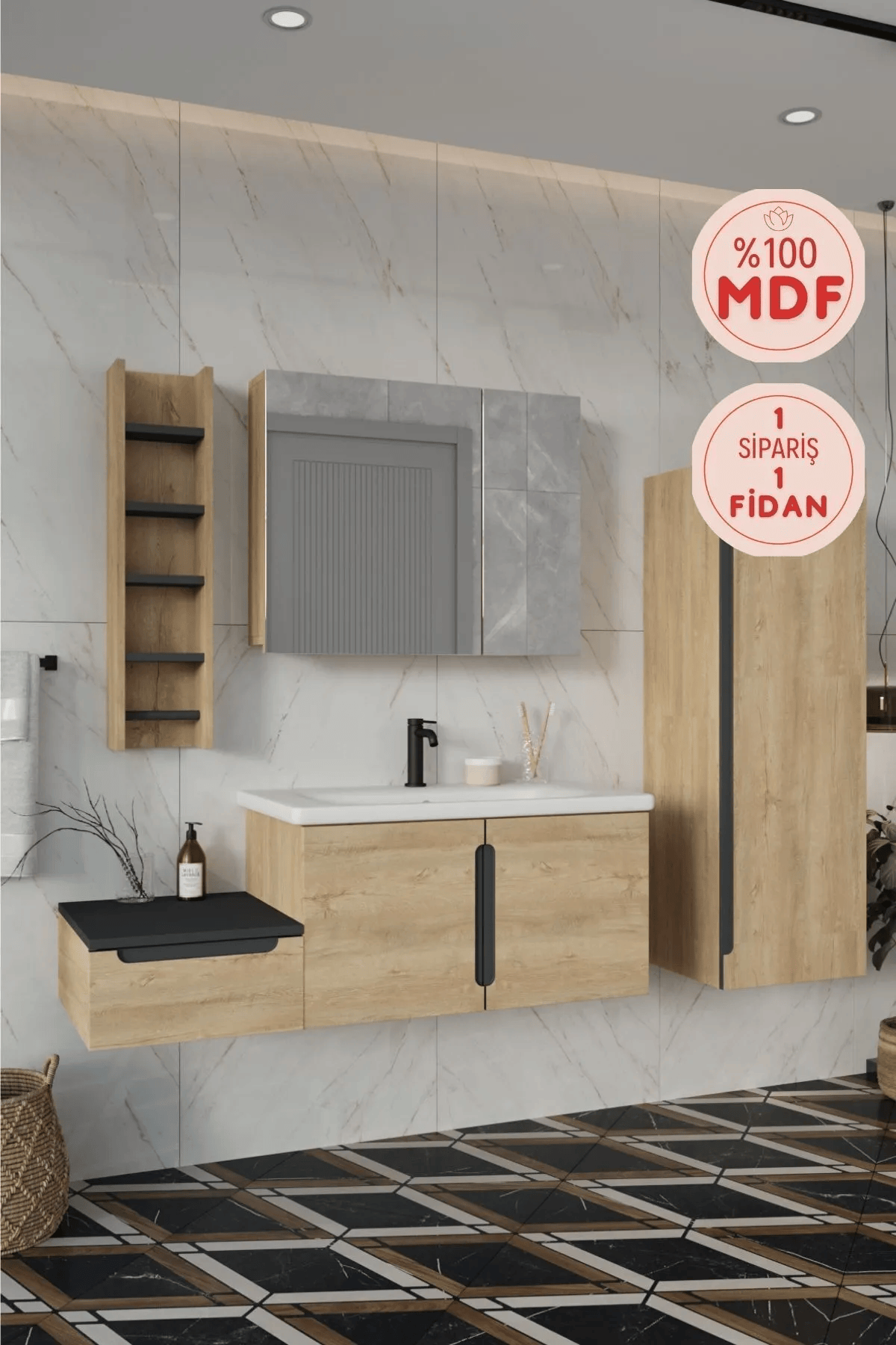 BALNEOM Zakkum 120 cm banyo dolabı, şıklığı ve fonksiyonelliği bir arada sunan modern tasarımıyla banyonuza değer katar. Lavabolu, aynalı üst dolap, boy dolabı ve havluluk detaylarıyla geniş depolama alanı sağlar. Suya dayanıklı %100 MDF malzeme uzun ömürlü kullanım sunarken, kolay temizlenebilir yüzeyiyle pratiklik kazandırır. Doğal renk tonları sayesinde banyonuza estetik ve uyumlu bir görünüm kazandırır.